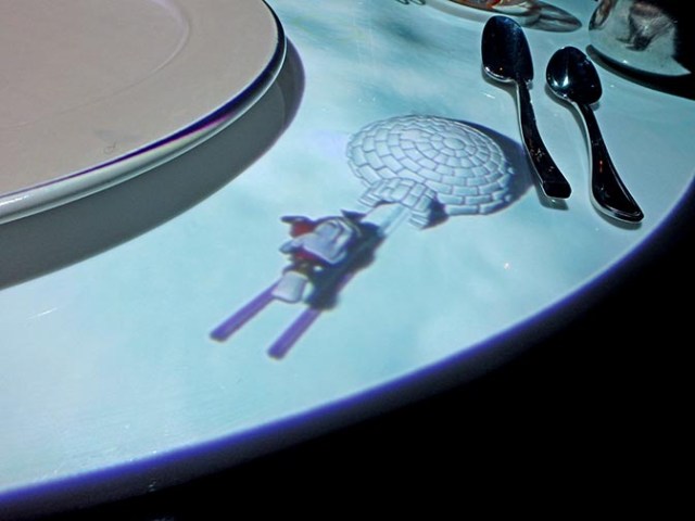Things on the table are set just so, as they need to be in the right place for the show. What looks like a plain white plate lights up around the edge when the show is about to start. The projectors are in the ceiling above, one for each plate, so the tables and chairs in this restaurant have to remain in the same place for it to work.