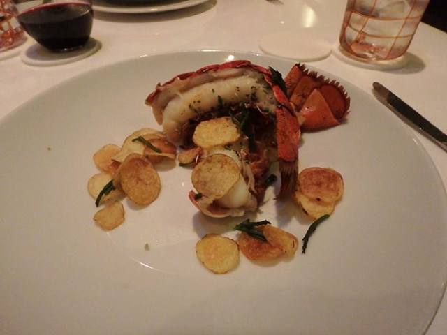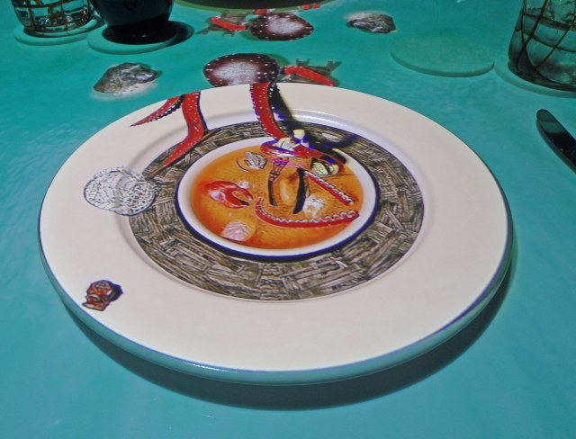 The second course is lobster. The little chef throws a fish on the plate, which attracts a lobster much bigger than he is. It doesn’t stay on the plate, but he ropes it, and after it goes back in the water, he comes out bronco busting on the lobster, which eventually after somewhat of a struggle ends up on the plate. The alternative for this course is sea bass.