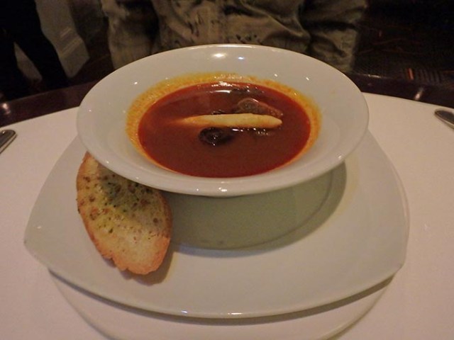 The first course is soup. Bouillabaisse is what the tiny little cartoon chef guy makes, but you can opt for French onion instead. To make the soup, he catches a variety of sea creatures and throws them on your plate. An octopus much bigger than him creeps its tentacles up onto the plate, but ends up losing a couple of them into the soup.