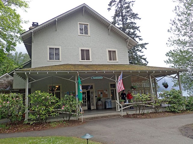 The main lodge and the log cabin resort are not next to each other and are accessed from different roads. The lodge is just off 101 on Lake Crescent Road while the log cabin resort is on East Beach Road near the access to East Beach and the trailhead to the Spruce Railroad Trail. The main lodge is not all in one building. The not all that big main building houses the restaurant, bar, and gift shop, and lodgings are sprawled about the area in different sections. The restaurant is only open at mealtimes, but in between people can order food to go at the bar from the restaurant menu and eat it in the attached sunroom with a lovely view of the lake.