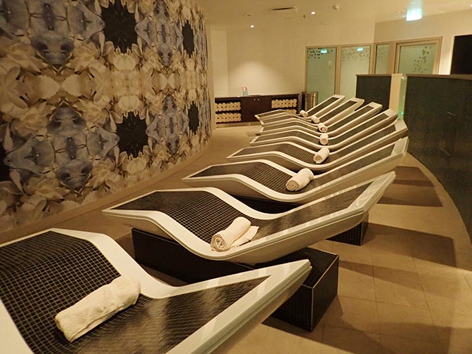 • It had a sauna, steam room, heated ceramic chairs, and for an extra charge a hot tub. I’ve never used the thermal suite on Royal so I don’t know if you need to book times or not. Royal ships have a really nice adults-only solarium with hot tubs and deck chairs with a view that is free to use.