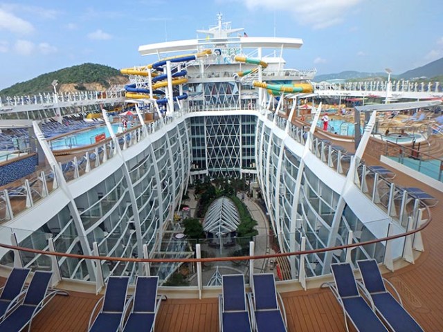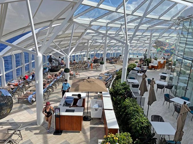 Lying around in deck chairs is always popular on cruise ships, and Symphony has plenty of those. At least there were plenty on our cruise with the ship at around a third of its passenger capacity. There are chairs in both shady and sunny areas on outside decks, and even a few at the water’s edge in the beach pool. There’s also lots of loungers in the more indoor location of the adults-only solarium, which has glass all around and above. The solarium also has hot tubs, its own towel station, a bar, and a bistro.