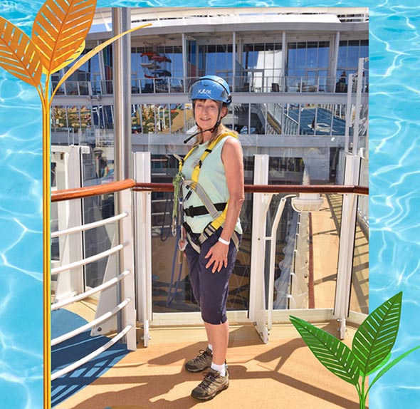 Symphony of the Seas even has a zip line. It’s just one short zip reminiscent of the easy sort of training one they sometimes have for people to give it a try at the beginning of a zip line course, but it is on a ship with limited space for such things. After I gave it a go one of the crew people working there asked what I thought of it. I said that my sisters would probably be more impressed as they’d never done one before, but I found the fact that they had one on a ship at all pretty awesome. He said they were trying to work up a way to make a better one. Sure enough, the sisters were both quite impressed since neither has ever done an actual zipline course. Barbara even had the foresight to ask if she could have another go rather than taking her equipment off as expected and since it wasn’t crowded they let her. Just as she was getting ready for that second go a photographer showed up so she even got a photo, something I did not take of anyone since we couldn’t take cameras or anything with us on the zipline so I didn’t have anything to take photos with at the time.