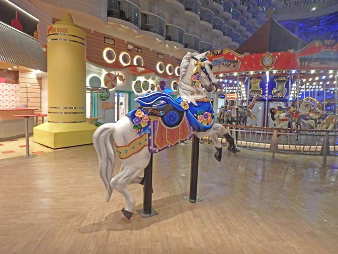 a row of carved carousel horse statues with each more finished than the last leads up to the completed one by the carousel