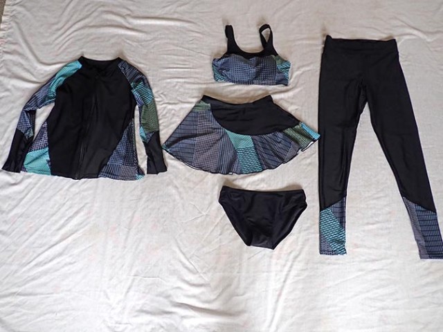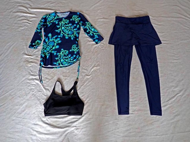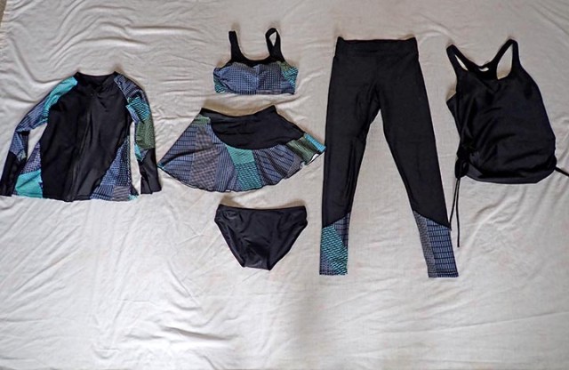 I found another site called Modlily (which now goes by Calypsa) that had full body suits. I ordered online with the help of their chat person to be sure I only ordered things they had in stock that could ship overnight. This company is located in the USA and expedited shipping actually means you will get the product right away. This was a 3-piece suit that consisted of long pants with an attached skirt, a full-length top with ¾ sleeves, and a swim bra, which could be worn alone as a top. The shirt had scoop neck or high neck options and considering as little sun exposure as possible was the goal I ordered the high neck, but without the tick thing I’d actually have preferred the scoop neck both in looks and fit. This suit was more expensive than the other, but the product is of better quality. Most importantly it came when they said it would so I had it when I needed it the most.