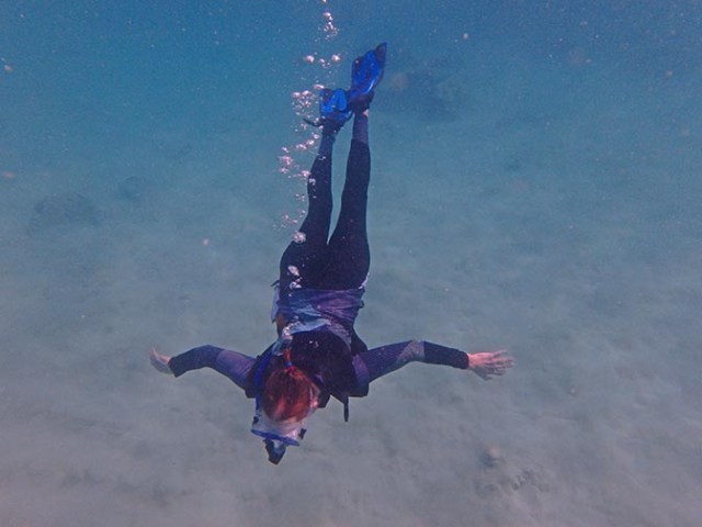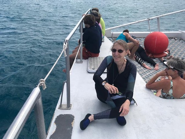 We had a snorkel excursion planned for our trip, which I did not want to cancel. Instead I ordered a full-body UV swimsuit, which would provide better UV protection than sunscreen does. The benefits with this sort of outfit for anyone are not needing to use sunscreen everywhere it covers and being able to stay out in the water longer as you are better protected than with sunscreen. Of course on snorkel excursions water time is limited to whatever the excursion has scheduled, but there have been times when we’ve been snorkeling from the beach on our own that I’d have stayed out longer if it weren’t for sunburn concerns. Obviously only coral safe sunscreen should be used in tropical waters regardless of what a person wears, even with the UV suit where sunscreen is only needed on your face and other limited exposed skin. A UV suit is also great for the flowrider when sailing on one of Royal’s ships that has one. Besides offering more body protection from the board or potential wipeouts on the flowrider than a smaller swimsuit, it’s also helpful when waiting in line in the blazing sun and for sun protection on the flowrider itself which is out in the open on the top deck. And there’s no worries about your sun protection wearing off or washing off after time spent in the water either.