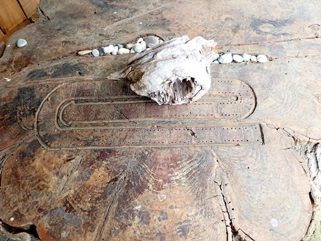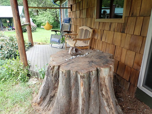 A large stump sat between the doorway and a porch with some furniture where people could sit outside if they wanted. The stump had a cribbage board carved into it. Cribbage is one of those games like backgammon that I used to play years ago, but no longer remember how. Not that I couldn’t look it up online if I really wanted to know. There were also some other games on a shelf in the cabin. A short distance from the cabin there was a firepit and some outdoor furniture.
