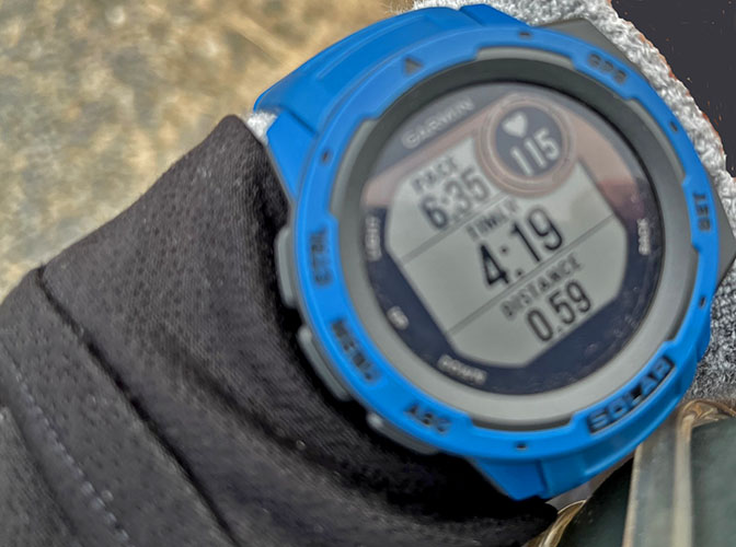 watch display while running showing pace, time spent running, and distance traveled. Also heart rate in the little circle.