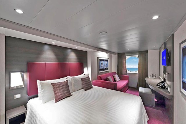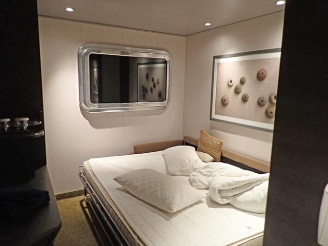 Amenities for all cabin types include two beds that can be pushed together for one king-sized bed, a closet, a bathroom with shower or tub, interactive TV, telephone, safe, and a refrigerator stocked with costly minibar items, which the steward can remove if you just want to use it for a refrigerator. In-room wi-fi is available if you purchase an internet package. Most rooms have a sofa, which in some can be converted to a bed. Some rooms have bunks or connecting doors to the next cabin. Studio and junior cabins just have a chair rather than a sofa.