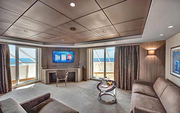 Deluxe Suites are 280-312 square feet with balconies from 54-161 square feet. The large balconies come with forward-facing suites on deck 15. These suites have the sitting area next to the bed resembling an oversized version of the standard cabins.
