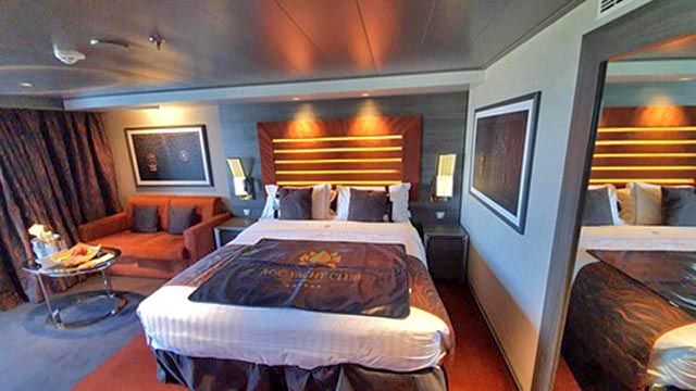 The Aurea suites are some of the nicest accommodations onboard as they come with large balconies and private hot tubs. These come in two sizes, the Grand Suite Aurea with terrace and whirlpool which is about 420 square feet with a balcony of about 388 square feet and the Premium Suite Aurea at 291 square feet with a balcony of about 280 – 323 square feet. These rooms have a sitting area separate from the bedroom that includes a double sofa bed.
