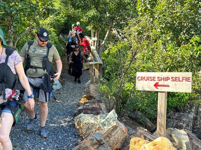 After everyone was harnessed up and ready we boarded the jungle bus again for a hairy ride on a narrow winding road up the mountain. The guide narrated things about the area, the island, and historical facts on the way up. The truck stopped near several short trails on top of the mountain. The first and shortest went to a viewpoint of a lagoon that used to be a salt pond. The second went up higher to a viewpoint of the harbor and the cruise ships at the dock. The third went down a bit to the entrance to the zipline.