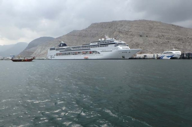 Weather on the sea days was generally clouds and fog with some sun and wind. One day had sun, wind, fog, and rain all within the same hour, though the rain was just a sprinkle. The ports tended to be sunnier. On the second sea day between Jordan and Salalah, Oman, another ship came near and the cruise ship dropped a speed boat which went to the other ship, picked up something, and came back. Normally the only boats that approach cruise ships are tugs going in and out of port, and pilot boats who drop off or pick up the local pilot who guides the ship through the channels leading into and out of ports or through narrow waterways. Another passenger we met who worked out in the gym with the guard crew said he was told the boat picked up guns for the guards, which they would need in case we came across any pirates.