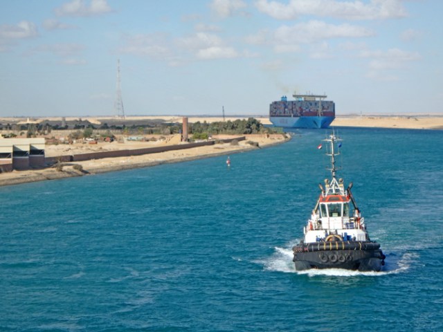 Cruising through the Suez Canal is a unique experience. It’s mostly a narrow waterway where ships follow one another through in a line, each escorted by a tug. A new part wide enough for two-way traffic allows ships to pass one another in that section, increasing the amount of ships that can pass through the canal in a day. One side of the canal has much more greenery and life than the other, which is mostly desert sand.
