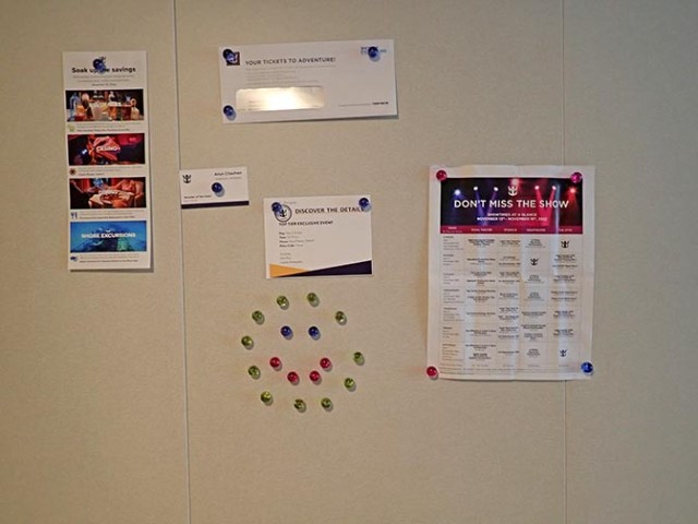 While the clothesline is enough to hang a swimsuit or two, if you do any handwashed laundry in the cabin you need more. Magnetic hooks came in quite useful for something to tie the line to as this shower had structure on only one side. Things did not dry well in that shower though, even with the bathroom door left open so most had to be moved elsewhere to finish drying. Once things were just damp rather than wet I could use those same hooks to zig zag a line along the wall where things could finish drying. Magnetic hooks are also useful out in the cabin for hanging sweatshirts or hats. Other than some really old cruise ships the walls are always magnetic so having some magnets to hang any paperwork you want to keep organized is useful too.
