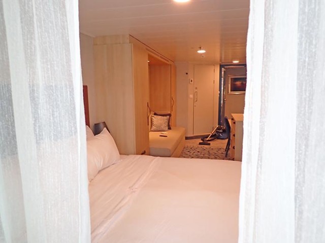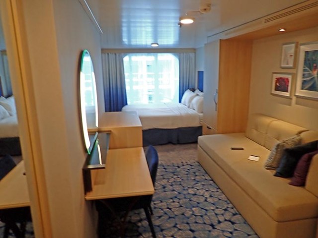 The cabin itself was about the same size as outside balcony cabins rather than small like a lot of inside cabins are. Bigger even than balcony cabins on many ships as it had space enough for a full-sized couch and two separate closets. It seemed slightly wider than the average cruise ship cabin as well with a bit more room between the foot of the bed and the wall than often found in cruise ship cabins. The large-screen TV hung across from the bed with a row of pegs underneath to hang things on. The cabin included a mini-fridge surrounded by drawers so it had quite a lot of storage area. There was a desk with a mirror and a separate full-length wall mirror. While some older ships have just one outlet and no USB ports, being a new ship this one had 3 outlets and 2 USB ports above the desk as well as 1 outlet and 1 USB port on the lamp on each of the two small nightstands.