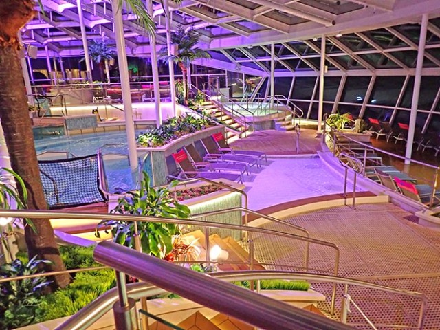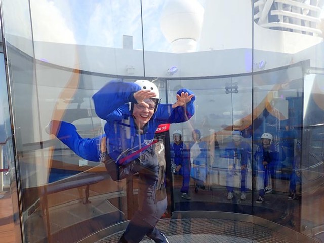 Most of the time we all had dinner together, and sometimes breakfast too. Sometimes we all did things together on the ship like taking a ride up in the North Star, a pod unique to Royal’s Quantum Class ships that rises up 300 feet in the air for an excellent view. Most of us also tried the skydiving simulator. We all went to a couple shows together, and for most of us the favorite hang-out spot was the solarium. Walking around and exploring the ship is always fun too, which we all did alone and in various groupings.