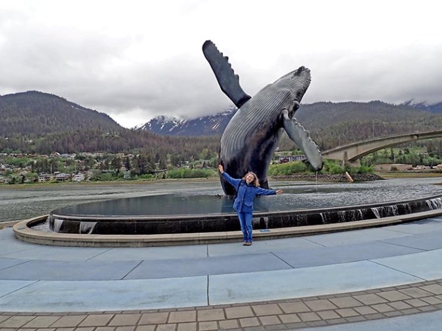 In Juneau the girls had booked a kayak excursion and the rest of us figured we’d go see what the booths on shore had to offer. Last time I was there they had all sorts of things, but this time they pretty much just had whale watching or busses out to Mendenhall Glacier. One had a sign for a trolley tour of the town. The girl in the booth said that wasn’t running that day, but they had a combo that did a tour of the town and went out to the glacier. We had all been to the glacier before on previous trips, but didn’t have anything better to do. She said the trolley would be running that tour, but the trolley was really a bus that looked like a trolley rather than an actual trolley. The town part of that tour was just the bus driver talking about stuff on the way to the glacier, though it did stop at a giant whale statue on the way back. Not surprisingly, the glacier is smaller every time we go there. We saw some kayaks near the glacier, but it wasn’t the girls. Their tour didn’t get that close. Kayaking to the glacier is something I’d like to do someday.