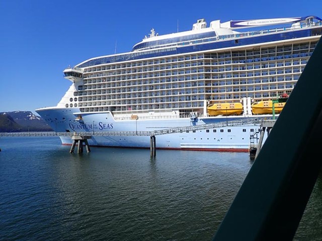 Our last port was supposed to be Victoria. We haven’t ever booked an excursion there before, but this time the 4 of us were going to go to Butchart Gardens while the girls did something on their own. Watching out our cabin window on the way to Victoria, the pilot boat passed by right under our window bouncing in waves that looked a whole lot bigger splashing over that little boat than they did compared to the cruise ship. The boat went out of sight before it got to where the pilot gets on the ship, too close to the ship for us to see it from our window. Many ports require a local pilot to guide the ship into port. Pilots have to get on and off ships in all kinds of weather to and from their little pilot boats. Soon we could see Victoria from our cabin window, and a Norwegian ship already docked there. We sailed past it, circled around, and sailed past again. Time came to go meet at the theater for our excursion and we were just outside the theater door when the captain announced that he and the pilot had decided it was too stormy for the ship to get into the dock. I’d never heard of a ship not making the stop in Victoria before. Maybe it happens and I just don’t know about it or maybe that ship is just too big for Alaska cruises. The bigger ships never used to go there.
