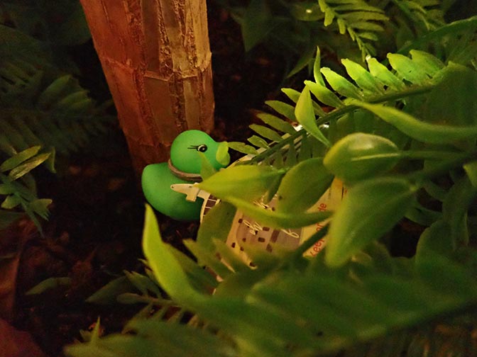 green duck blending in with the fake foliage in a planter