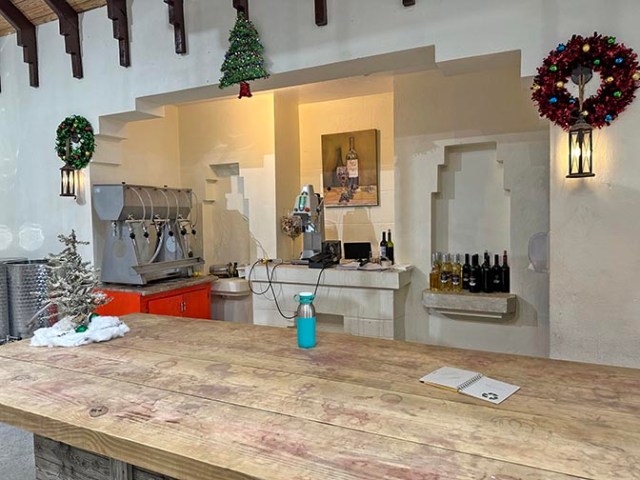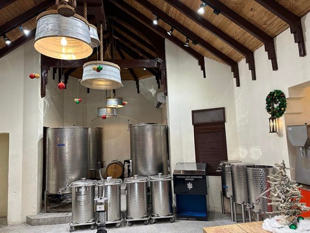 blending and bottling. Several varieties of reds and whites fill barrels or vats