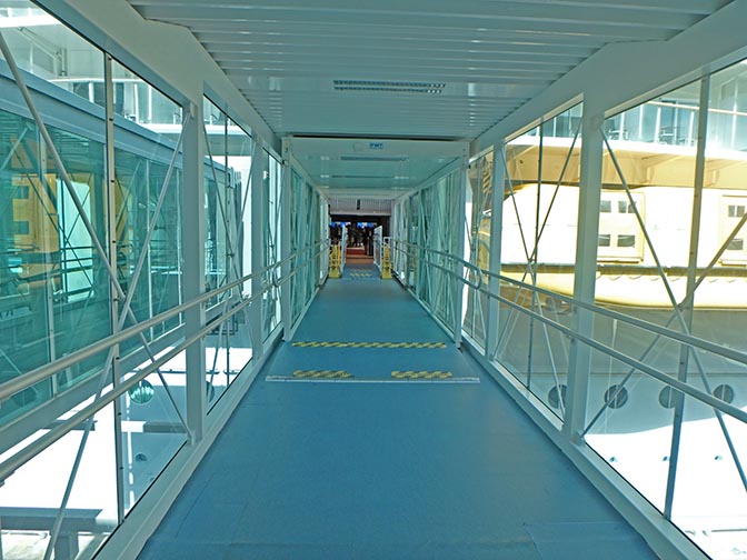 The gangway connects the ship to the port building and is the way passengers embark and disembark