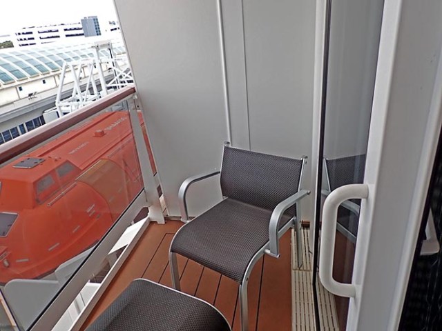 The balcony was a bit on the small side with just room enough for 2 chairs and a small footstool. We were on the deck above the lifeboats so our view was not blocked by them, but we did look over the top.