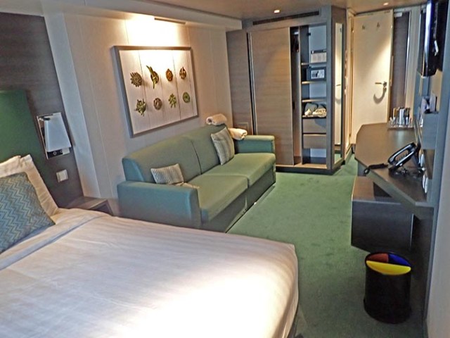 The room had two beds that can be pushed together to make one, as is found in the majority of cruise ship cabins. The bed on this ship was quite comfortable. The room had a full-sized couch. The small refrigerator was set up as a mini bar, stuffed full with items that you have to pay for. We asked the steward to remove them so we could just use it as a refrigerator. There was no room to put anything else in there with all the mini-bar items taking up all the space. Stewards will always remove those items if you request it.
