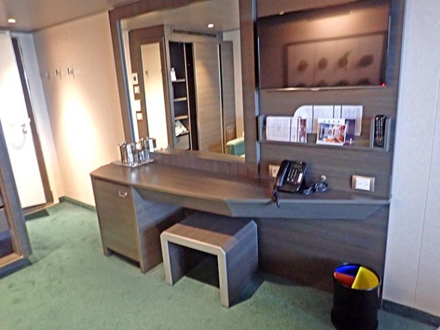 Bathrobes are another thing that used to come standard already hanging in the closet of all the cruise ship cabins upon arrival, but lately I have had to ask the steward for one on every ship. This one was no exception. They do at least still bring one when asked for it. The other thing I had to ask for on this ship was washcloths, which normally are included with the other bath towels as standard bathroom supplies. Probably because this is a European ship, and for some reason Europeans don’t seem to use washcloths much. Very few hotels we’ve stayed in anywhere in Europe had any.