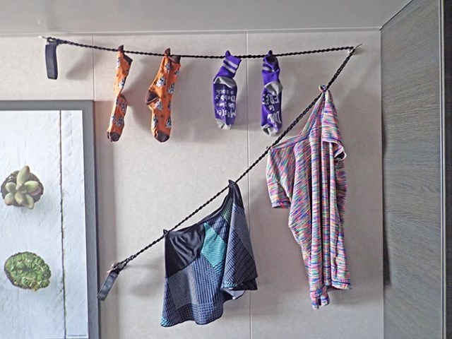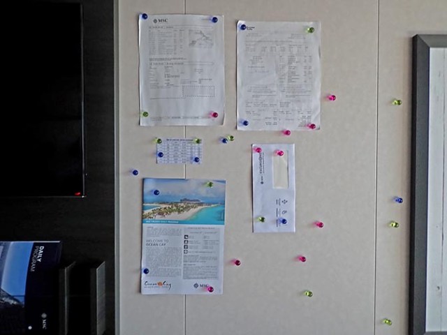 Like all modern cruise ships, the walls in the staterooms on the Meraviglia are magnetic. This comes in quite handy if you bring magnets to keep any paperwork organized and within easy reach on the wall. Also good for magnetic hooks, which can be used for more hanging space for clothes or other items. The hooks also come in handy for holding laundry lines. There is no self-serve guest laundry on the Meraviglia and sending laundry out to have it done by the crew is always expensive on cruise ships. The line provided in the shower is barely big enough for a couple swimsuits and this shower had structure only on one side so the magnetic hooks came in really handy for zig-zagging extra line through the shower to dry things. Stuff didn’t dry well in that bathroom even with the door open though, so once things were no longer dripping and more damp than wet lines could also be zig-zagged on the cabin wall using magnetic hooks for things to finish drying.