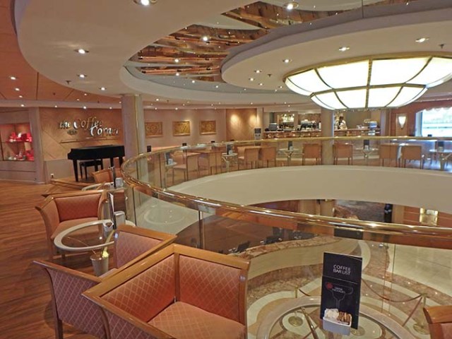 The ship had a nice coffee bar. I don’t drink coffee, but my husband John was disappointed that the coffee bar was not open in the morning when he would have sometimes liked to have a specialty coffee. The only place open to get that in the morning was the stinky smoking pub. He also wants decaf, and there wasn’t any available at the buffet unless you order from bar service and pay for it. Instant decaf packets were free in the dining room, but when he ordered one they didn’t actually bring it to the table in time for him to have it with his breakfast so he just ended up having that packet to bring to the buffet later. Ordering one at dinner for the next day’s breakfast turned out to be the best solution – but that involves remembering to do so.