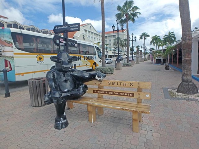Horses were not the only farm animals about town. We came across a cow sitting on a bench near a steak house.