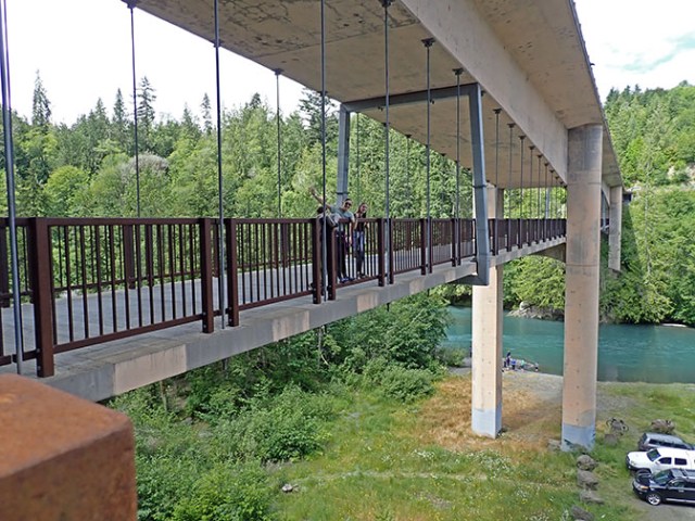 It’s not part of the Olympic National Park, but in the same general area not far from Madison Falls there’s a pedestrian bridge suspended from one that cars drive over. It’s just a short side trip down 112 to Elwha River Road from Highway 101 and worth a photo stop. The pedestrian bridge is part of the Olympic Discovery Trail, a mostly paved trail with sections all across the north end of the Olympic Peninsula. Also nearby just off Highway 112 there’s a wide spot off the highway with room for about 10 cars to park that passes as a trailhead for the Olympic Discovery Adventure Trail, a dirt trail that goes from there to Lake Crescent. It is also not part of the park at that end though Lake Crescent is entirely within the park. Both the Discovery Trail and adventure trail are dog friendly.