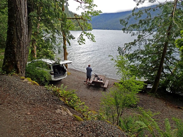 Lake Crescent boarders Highway 101 with a pull-out for photo ops so it’s easy to get photos of the lake without venturing up to the lodge or any of the area’s trails. The roadside pull-out has a couple informative signs and a parking area as well as a nice view of the lake, but no picnic tables or anything. The map they picked up at the visitors center down the mountain from Hurricane Ridge showed a picnic area called La Poel on the lakeshore a bit farther down the road than the lookout. We decided to go there for lunch. It was a very short distance off the highway and set up like a campground with individual little places for each car, each one with its own firepit and picnic table. Only one of them was right on the lake and of course it was already taken. So was the one closest to it, but none of the others were so we got one just above those with a view of the lake. The Spruce Railroad Trail along the opposite shore of Lake Crescent from where we were is both dog-friendly and a small segment of the Olympic Discovery Trail.