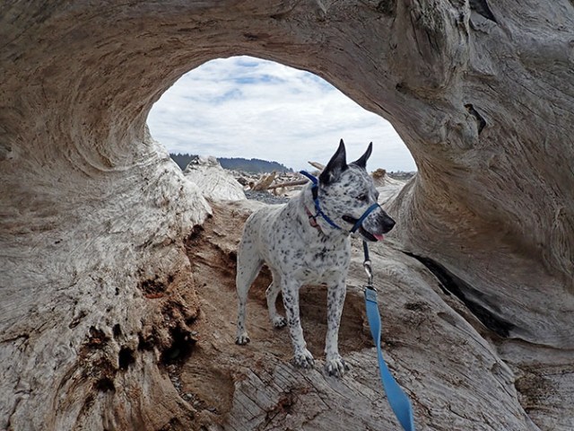 Rialto Beach is near the center of the park’s beach areas. It has a pretty extensive parking area, which was nearly full the day we went there. It’s the sort of beach that gathers driftwood, which on this beach is mostly whole trees. From the parking lot people go up a little hill and through the driftwood forest to access the beach, which you can’t see from the parking lot due to the rise of the driftwood covered land. The top of the beach is mainly small flat rocks, but there is sand down by the water. Rialto and some of the other park’s beaches are among the few dog-friendly areas within Olympic National Park.
