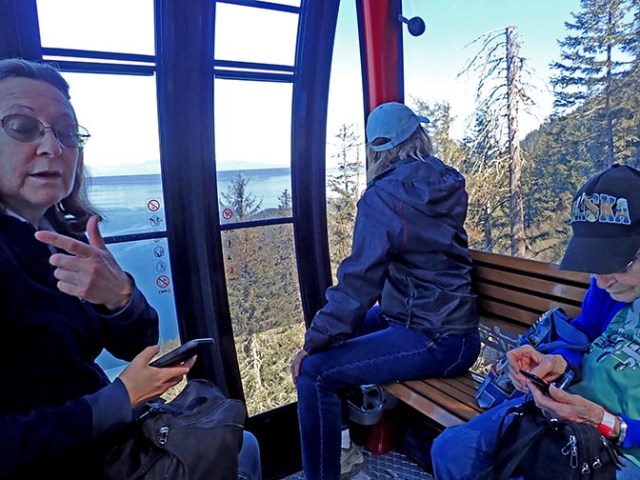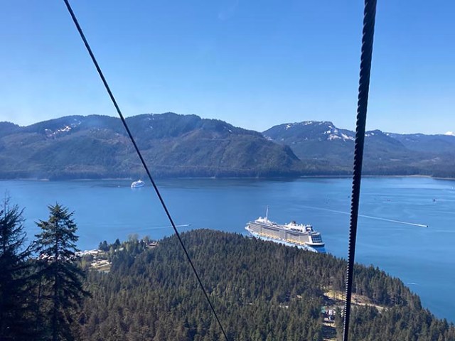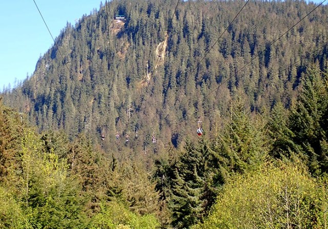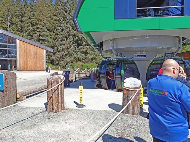 It’s really a fun ride and it comes with an excellent view. At least if you get a clear sunny day like we had. It also comes with unlimited gondola rides so you can ride the red gondola back up the mountain again after the ride. You only get one time on the ZipRider per ticket, but if you go up again you can ride the gondola back down. The green gondola between the two cruise dock areas is free so you don’t need a wristband for that one. There was no line at the green gondola when we got done with the zipline so we took it back to the other area and went back up the red gondola, whose line also had cleared by then. We were going to hike the trail at the top, but somebody said there were bears nearby and wouldn’t let anyone go on the trail unless they were in a guided group, which had just left.
