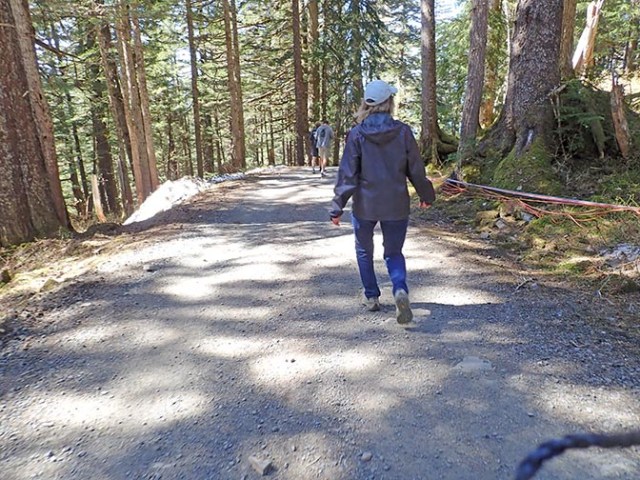 The pathway from there to the zipline is a sometimes rough dirt road running through the woods. Even though large piles of deep snow lined both sides of the road in some places it was a nice day and not cold at all. We did not see bears or any other wildlife. When we were nearly to the top of the zipline we passed a row of 4 honey buckets. I guess they want to make sure anyone who is nervous about heights or ziplines has a chance to empty their bladder before they go to avoid any fear-induced accidents along the way. It’s also useful when it takes a really long time to get there and you need to go anyway, or if you just want to avoid lines in the more crowded areas of the port. It even had a handwashing station with actual water next to the honey buckets.