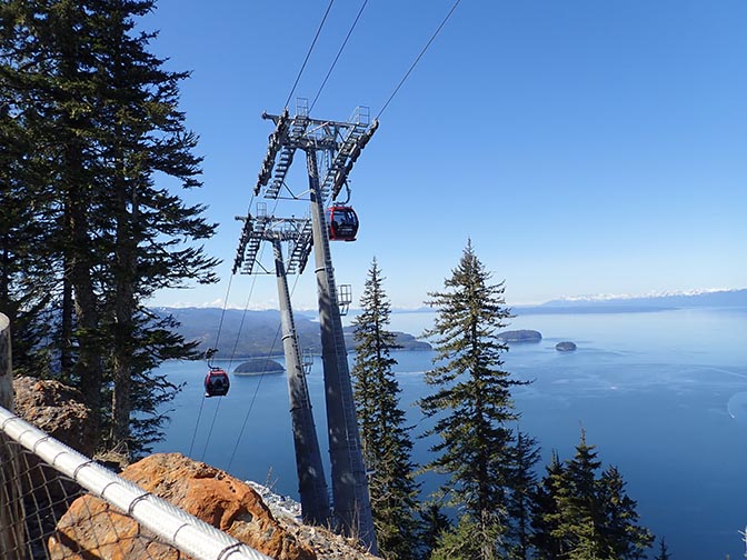 view of the red gondola from the top of the mountain