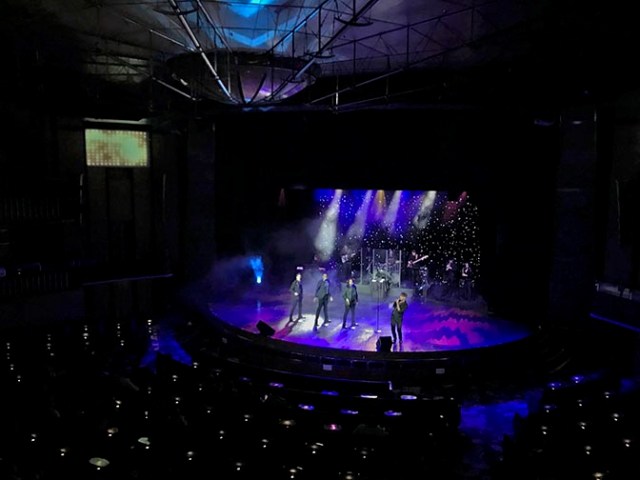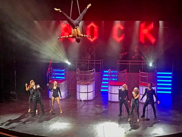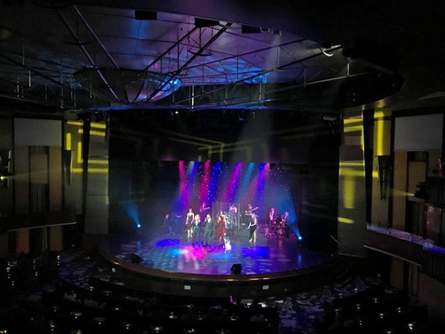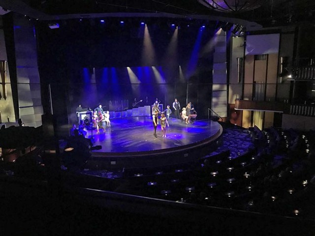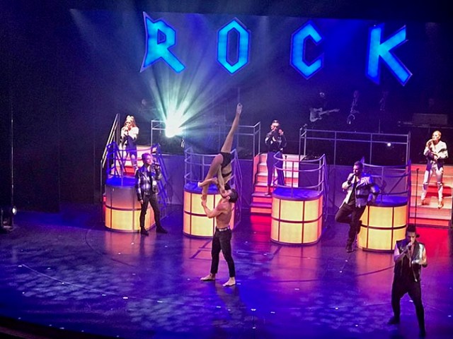 Night five brought a production show called Rock City with the ship’s cast of singers, dancers, acrobats, and an aerialist. Most of the songs are familiar to anyone old enough to have grown up with them, which is probably the majority of the people onboard since Celebrity generally caters to an older crowd. Though still less than a third full, the audience had the most people we’d seen at a show on that cruise. Only the male aerialist performed in this show, his female partner was nowhere to be seen. The last couple numbers had boys in skirts with 3 of the acrobatic type dancers.