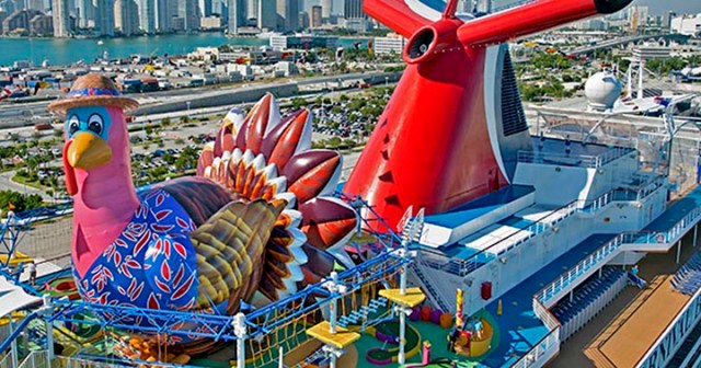 We had one memorable Thanksgiving spent in a hotel in Miami between cruises, but had never actually been on a ship for Thanksgiving before our cruise on the MSC Meraviglia. The Thanksgiving spent in a Miami hotel is memorable not just for being between cruises, but also because there had been a big storm and there was no internet within a wide swath of the hotel. We had to walk a mile or so to a Burger King or McDonalds to have internet access during the few days we were there. On Thanksgiving everything was closed so our Thanksgiving dinner that year consisted of microwave macaroni & cheese in our hotel room. There hadn’t been any Thanksgiving decorations on the Carnival ship we’d just got off of during our sailing, but as we were leaving the port we saw they had just put up a giant blow-up turkey for the next cruise.