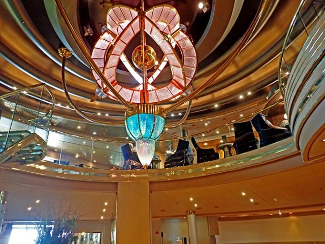 Holland America Noordam is one of their directionally named ships. Sister ships of the Vista class are the Oosterdam, Westerdam, and Zuiderdam. P&O’s Arcadia is also of that same ship design. Noordam began service in 2006 and is the 4th ship to carry the name Noordam. It’s also the 4th of the current line of directionally named ships. As the name sounds, Noordam is North. Westerdam is obviously west, Oosterdam east and Zuiderdam south. The atrium centerpiece appears to be the original. I haven’t previously been on the Noordam, but my last time on the Oosterdam it still had its original crystal globe that though not exactly similar to the Noordam’s centerpiece, the style resembles it enough for it to be original. Unfortunately the Westerdam’s original crystal sailing ship centerpiece (which was the most beautiful centerpiece of the three ships) had been replaced by an ugly gray spiral the last time we were on that ship.