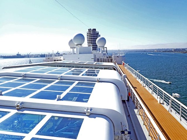 Another nice thing is having an outside promenade deck that goes all the way around the ship, which is a nice place both to get some exercise and to see what is outside. You can see in any direction other than forward from the promenade because it is closed-in as it passes around the bow. The best forward view is from the Crow’s Nest lounge on deck 10, which has floor-to-ceiling windows across the bow. There is an open bow on deck 4, but that is only available to passengers when sailing through particularly scenic places.