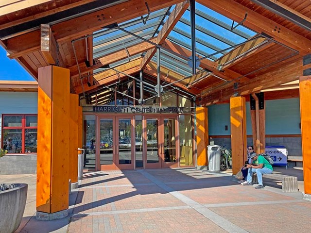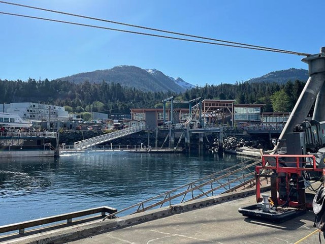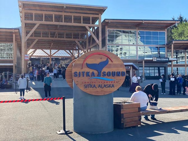 Now it’s called Sitka Sound Cruise Terminal. The dock holds two ships. A constant stream of busses shuttles passengers to town. The free ride takes about 15 minutes to or from town. The lines can get long, but they move quickly. As soon as one bus leaves another takes its place.