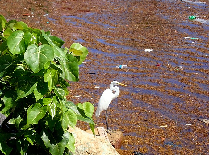 white bird overlooking seaweed and garbage