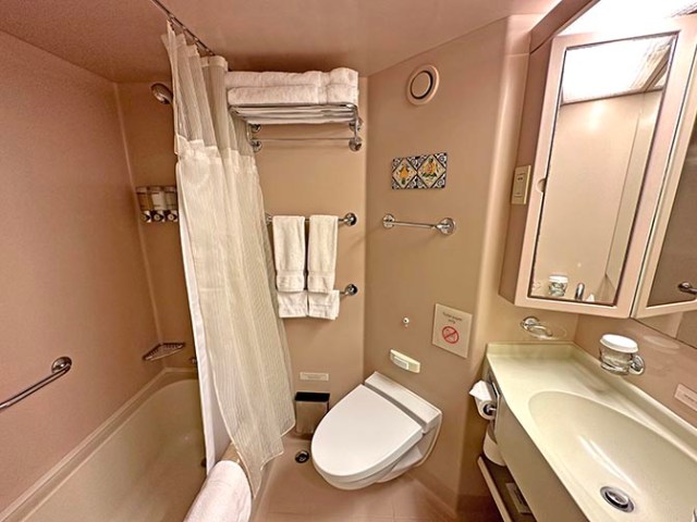 Ocean view cabins come in both obstructed or not, with obstructed cabins being the least desirable and therefore less expensive. Some of those are fully obstructed by a tender boat, but others that are marked as obstructed will have a partial view so it’s a good idea to check where the cabin is located on the deck plan before booking because moving just one cabin over can mean the difference between looking directly into a tender or having a partial view between tenders. Cabins behind lifeboats rather than tenders may have some view above the lifeboat. Of course cabins with an unobstructed view are preferable. Cabins on the lowest deck are generally considered the least desirable by the cruise line and therefore less expensive than equal cabins on a higher deck, but if you like a close to the water view, convenience to the gangway at ports, or to head the opposite way of the crowd after shows or meals those rooms are actually a plus. They’re also beneficial if you don’t like the motion of the ocean because lower down as well as closer to the center will reduce the motion that you feel from the waves. Toward the back of the ship there may be engine noise so those aren’t the best for light sleepers. Toward the front you have the best chance of seeing flying fish, but you will definitely hear when they drop anchor, and when sailing in stormy seas it can sometimes sound as if the ship is running over logs in those cabins. On this ship everything other than inside cabins has a bathtub while the inside cabins just have a shower. This is not including accessible cabins which are more likely to have a roll-in shower than a tub. Ocean view cabins are about 174-180 square feet.