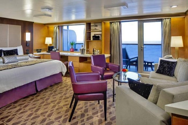 Their more premium suites are called Neptune suites. Besides being larger, they come with more perks. In addition to the extras in the signature suite, these have many more things including priority embarkation, free laundry service, in-room coffee machine, a better room service breakfast menu, breakfast in the Pinnacle Grill, premium amenities, priority tender, and a few other things. They also have use of the Neptune Lounge where suite guests can go for convenient breakfast or snacks. Including the balcony these are over over 500 square feet. You can tell where the suites are when you walk past them down the hall because the doors are wider than the ones on standard staterooms.