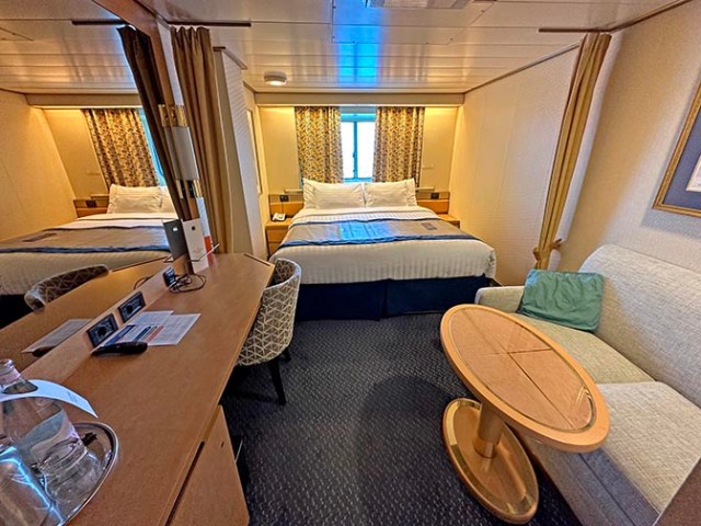 Inside cabins are the least expensive so they are good for budget cruisers, people who spend very little time in their cabin, and people who like darkness for sleeping when it is light outside. Some of these cabins are oriented with the short side to the hallway like most other cabins, but some are set long way toward the hall. Others are more squarely shaped depending on their location within the ship. With any cabin it will usually be quieter if you are away from elevators and on a deck that has other decks with just cabins and no public areas both above and below your cabin deck. Cabins of all varieties have closets and some other storage space as well as some sort of table and somewhere to sit besides the beds. Interior cabins range from 151-233 square feet. Larger ones are billed as large interior cabins, though the biggest of all in any category tend to be the accessible cabins.