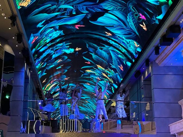 The domed ceiling of the ship’s promenade area was a video screen which usually displayed one of a variety of still designs. There were also brief dome shows scheduled throughout the day where one of a number of different videos showed anything from random colors to a submarine voyage to a real-time view of the same lighthouse show as a real lighthouse had going near the dock just outside the ship while it was at MSC’s private island called Ocean Cay. Sometimes in the evening they had a camera out in the promenade that would display whoever walked nearest to it in a series of picture frames along the dome.