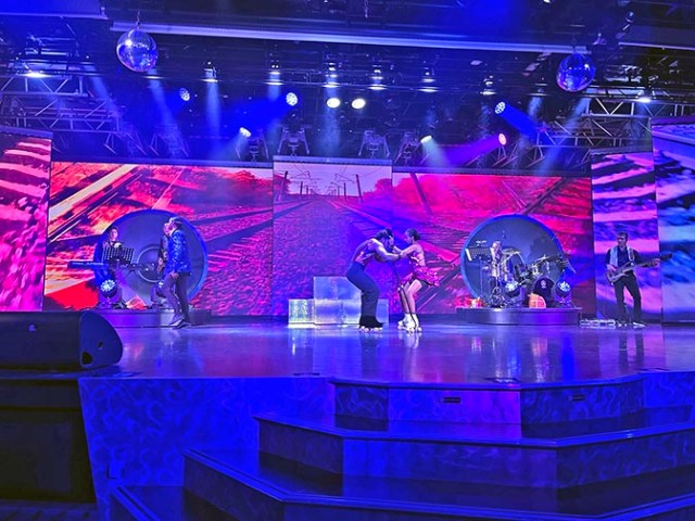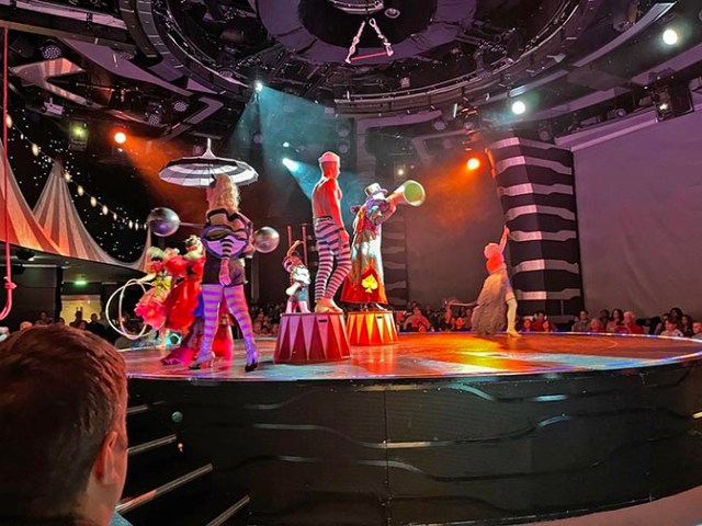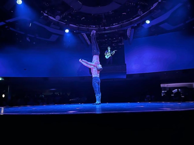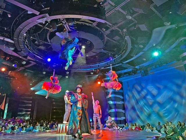 When we went to the Rock Circus show we knew to get there earlier, so we got better seats near the front of the stage. We could see the whole stage and the video wall from there. Regardless of whether or not we’d had better seats, the Rock Circus was by far the better of the two shows at that theater, but the price is so minimal it’s no stretch of the budget to go to both. Tickets for the theater can be purchased online before the cruise, but reservations for the particular performance you attend have to be made onboard. The Rock Circus show had lots of talented performers with a variety of aerialists as well as dancers, acrobats, and a singer for a fast-paced lively show with colorful lighting effects. It’s the same people as in the Houdini show, the rock one is just a better show.