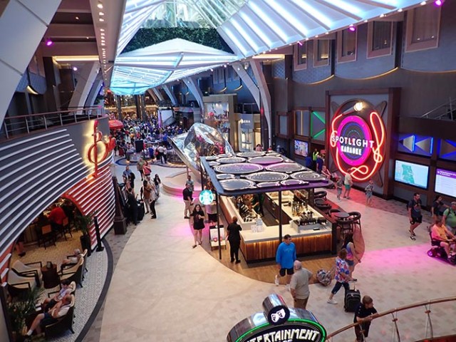 The Royal Promenade looks something like a city street with shops, bars, and eateries along the sides and even a karaoke spot. This is where the bionic bar is found where the bartenders are robots.